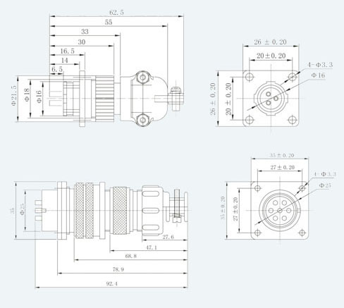 CP型连接器有外壳配合直径为16、25(mm)两种规格。每种各有几种接触对可选。