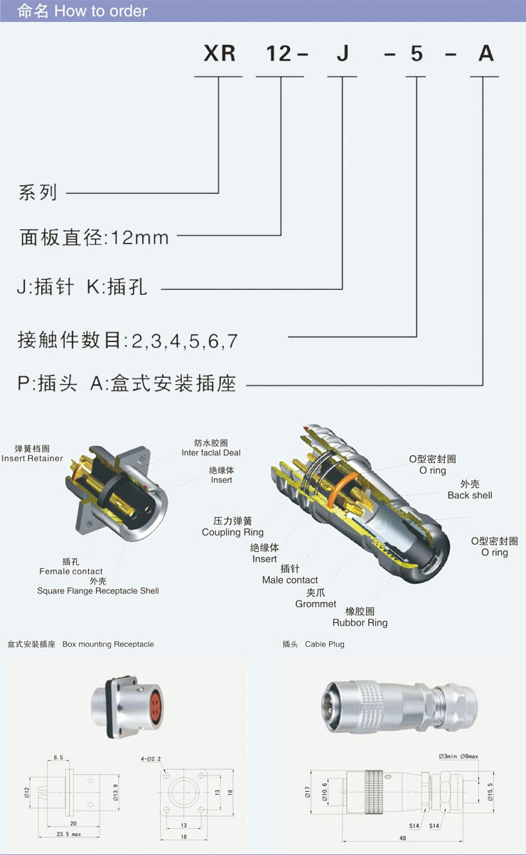 XR12系列连接器的外壳配合尺寸为12mm,接触对数量有2,3,4,5,6,7芯五种,可直接安装在面板上使用,连接器外壳为黄铜,外形小巧美观,连接形式为推入式钢球锁定,插拔迅速方便,本产品适用于各种仪器仪表,电子设备等交直流电路的连接。
